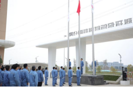 07:55,全体员工着工装整齐排列于博科新材办公楼前坪。08:00,袁总宣布升旗仪式正式开始,旗手们迈着整齐划一的步伐,护着旗帜昂首阔步走向升旗台。随着雄壮的《义勇军进行曲》响起,五星红旗冉冉升起,全体人员庄严肃立,向国旗行注目礼。